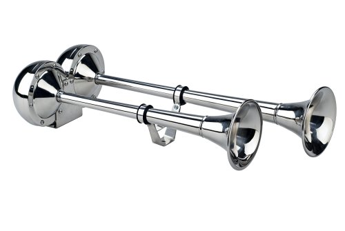 THE DOMINATOR Model 125 low and high tone dual trumpet is made from steel 304 non-magnetic grade materials. For exterior roof mounting on trucks, vans, RV’s and boats it produces a powerful dual trumpet sound that is sure to be heard. The Dominator is ideal for any 12-volt electrical system, does not require a compressor or hoses and is maintenance free. Designed to give years of dependable service in any environment including salt water and includes a stainless steel adjustable trumpet support to prevent vibration. The kit comes complete with stainless steel mounting hardware and rubber gaskets. 116 Decibels – 330/408 Hz. Dimension: L 18-1/2 in. x W 8 in. x H 4-1/2 in.